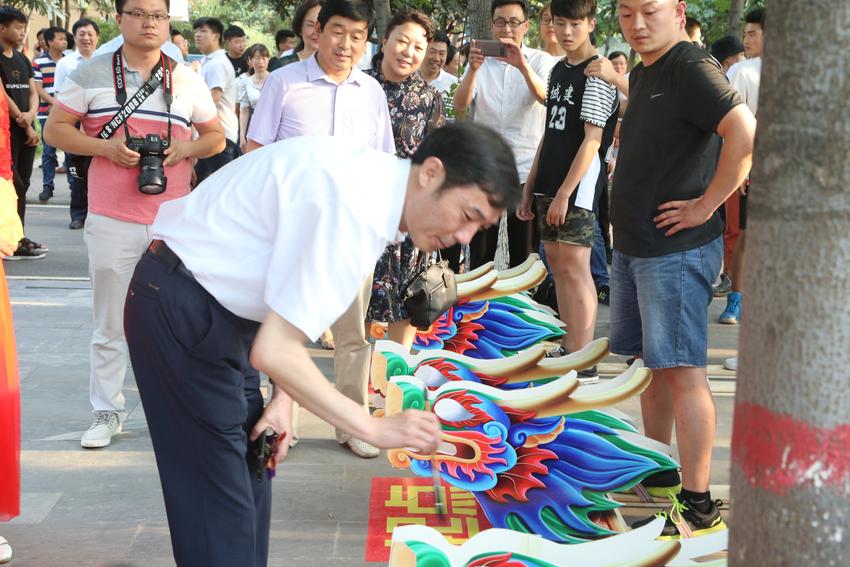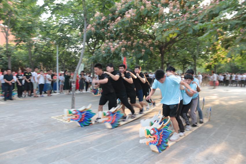 在整装待发的“龙舟争渡迎端午”活动现场,与会领导为龙舟点睛,南阳市委宣传部讲师团团长周旭宣布比赛开始,随着党委书记胡龙廷扣响发令枪,选手们奋勇前进,争相到达终点。20多支代表队在赛龙舟活动中,通过“旱地龙舟竞渡”的形式为广大师生呈现出一场集艺术性、竞技性、趣味性为一体的民俗文化活动。