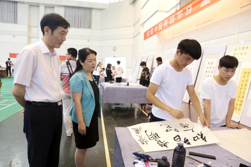 随后,与会领导来到体育馆,在“翰墨书香印端午” “粽叶飘香品端午”“ 荷包款款香端午” “民俗文化闹端午”等活动前驻足,欣赏师生书写古代先贤的家国情怀,欣赏剪纸艺术传承人栗新禧剪出的反映汉代社会生活、舞乐百戏、天文星象、历史故事等十大类作品,感受广大师生一起动手包粽子、制香囊的热情和传统民俗文化活动的魅力。