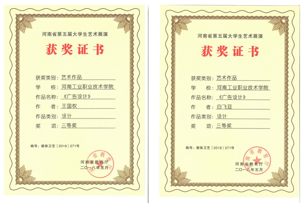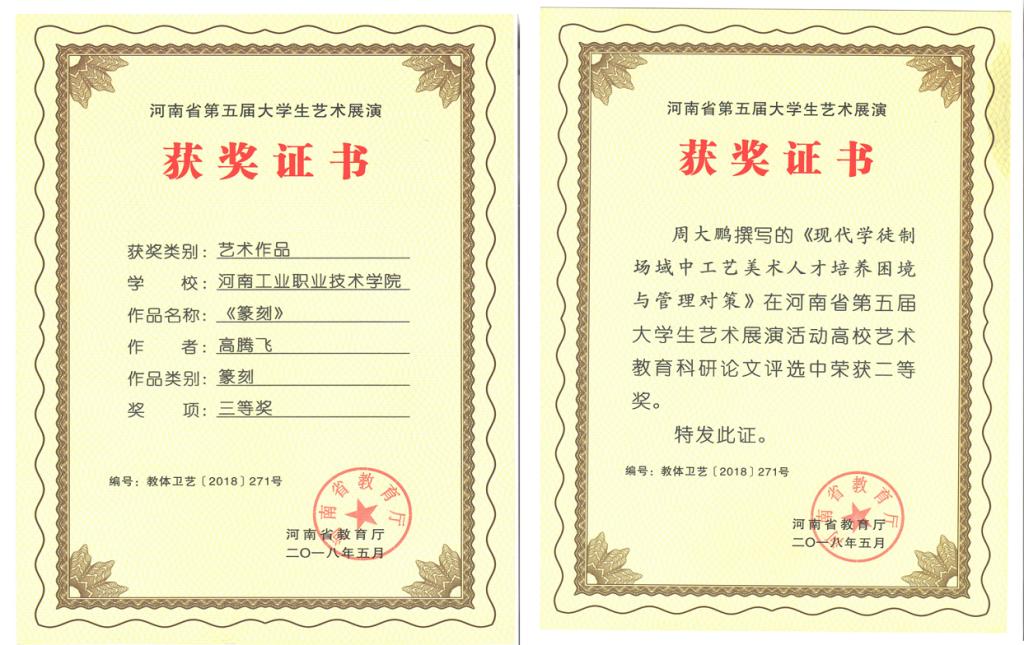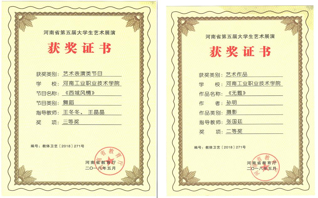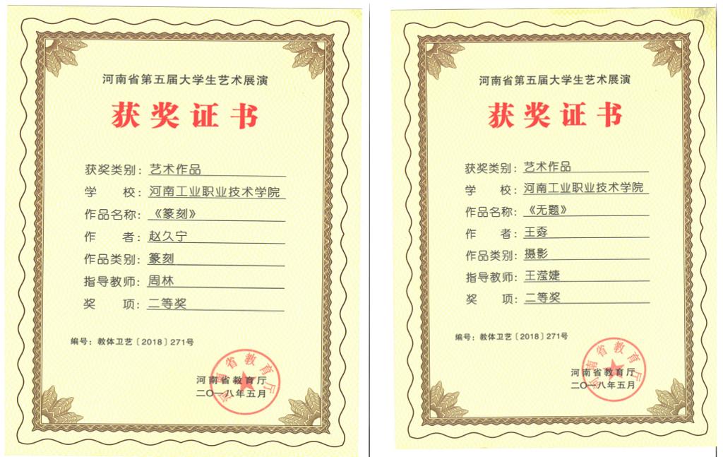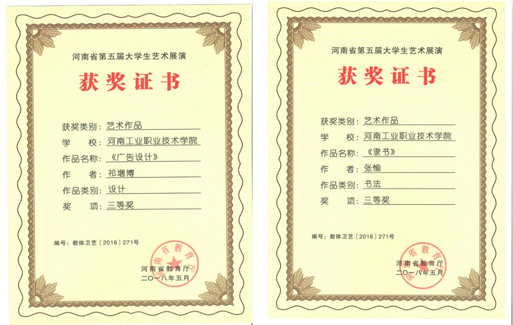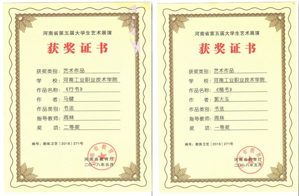 河南省教育厅第五届大学生艺术展演2017年6月至10月在我省举办,我校艺术教育中心精心准备60多件作品上报参展,其中教师组荣获一等奖作品1件,二等奖5件,三等奖3件,学生组作品获奖5件,共获奖项14项。