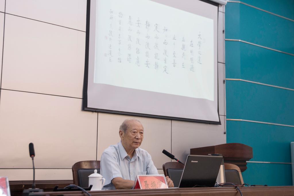 聂振弢教授谈到,中国文化引领世界文化的潮流,习总书记在视察曲阜时买了论语,引导我们全民学论语,习总书记在所有场合都提倡学习传统文化。教师的历史使命就是立德树人,传承创新发展传统文化,做好对当代大学生的人生目标和价值取向的正确教育与引导。聂先生以《大学》“大学之道,在明明德,在亲民,在止于至善。知止而后有定,定而后能静,静而后能安,安而后能虑,虑而后能得……”为切入,引古喻今,言微理举,教育大家一定要把“忠信孝悌”铭记心中,孝悌在家,忠信在外,在家孝敬老人,热爱自己的兄弟姐妹,走向社会就应该为国家为民族为人民而努力。聂教授以个人的成长为例,讲述了好的“家风、家教、家规”对人生影响,自己取得的成就正是祖辈、父辈的教育和优良家风深远影响的结果。聂振弢渊博深厚的学养,旁征博引的讲述,浓郁的家国情怀,赢得了听众一片掌声。