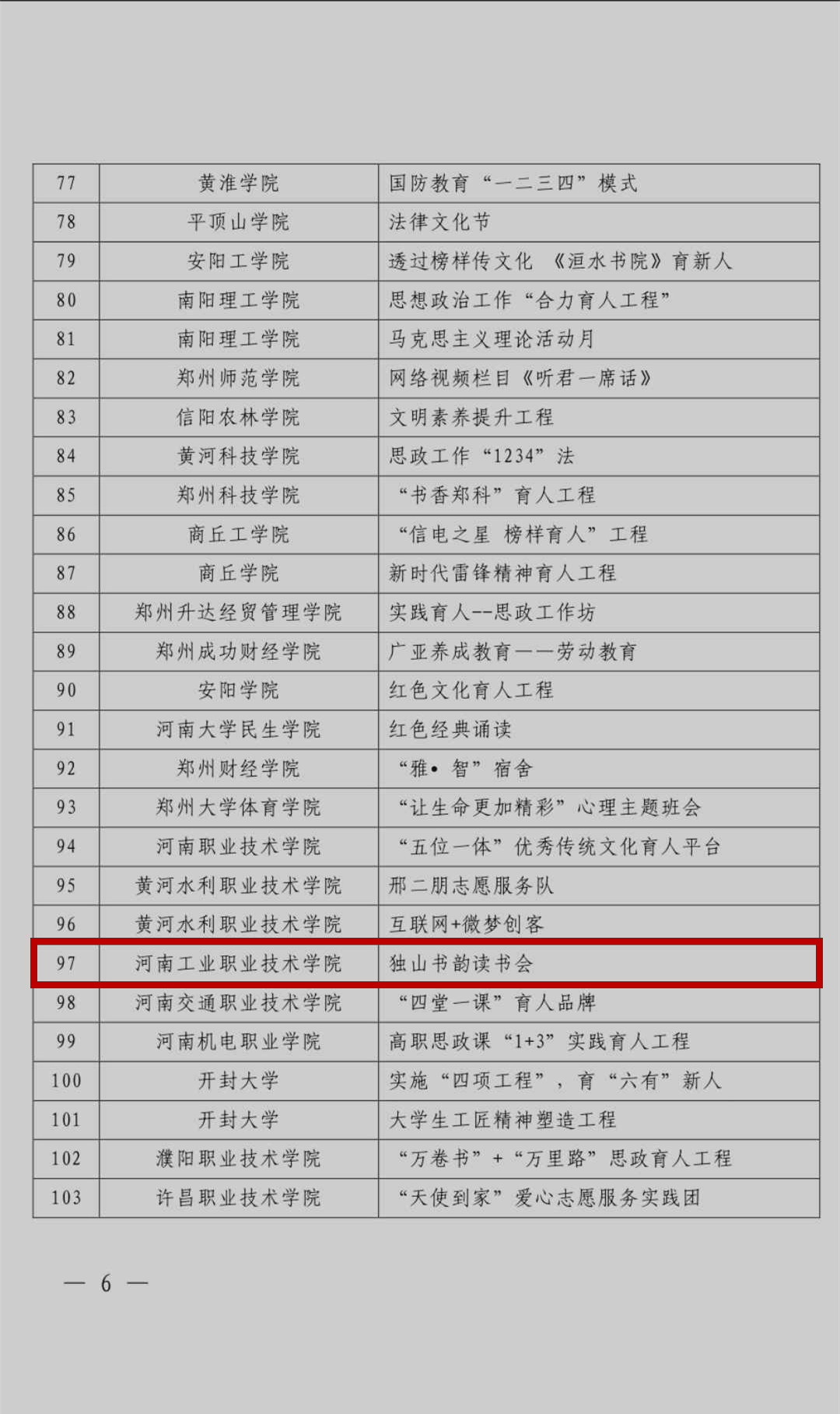 近日,中共河南省委高校工委、河南省教育厅下发通知,公布了“2018年度河南省高等学校思想政治工作优秀品牌”的评选结果,我校申报的“独山书韵读书会”被评为“2018年度河南省高等学校思想政治工作优秀品牌”。
