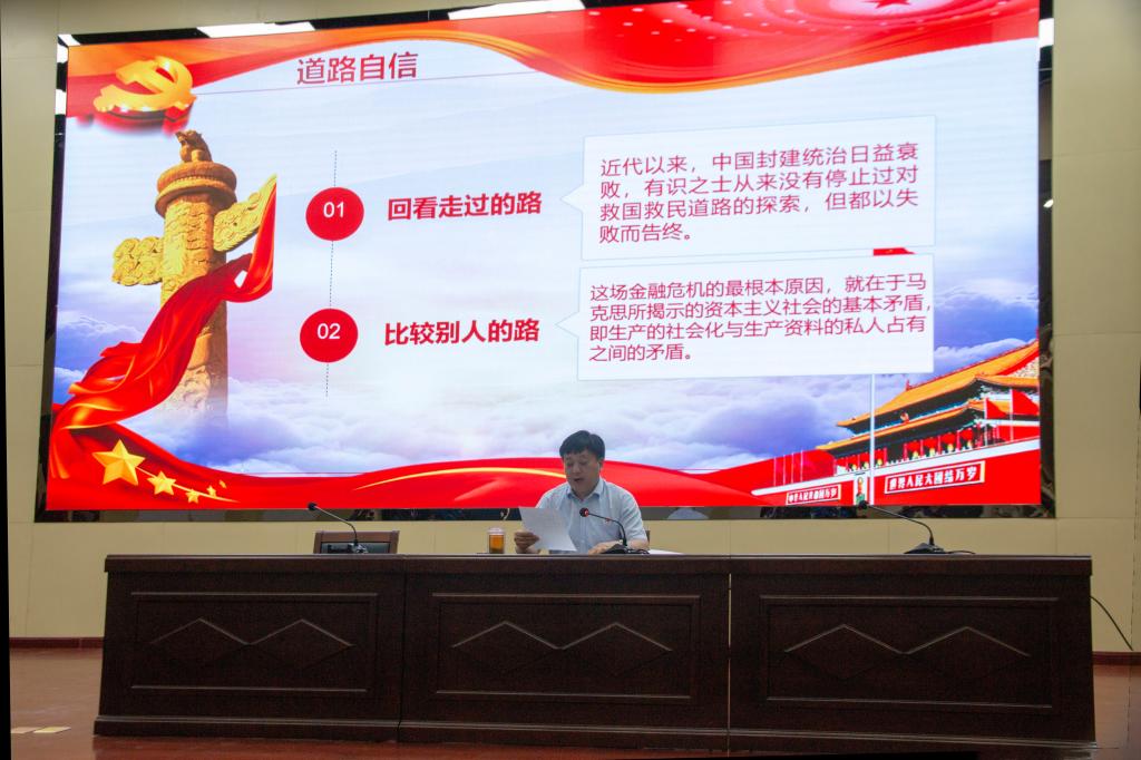 为全面贯彻落实全国高校思想政治工作会议精神和习近平总书记在学校思想政治理论课教师座谈会上的重要讲话精神,6月4日下午,学校党委书记温道军以《坚定“四个自信”,共筑伟大梦想,用不懈奋斗谱写壮丽的青春诗篇》为题在大学术报告厅给全校师生讲授了一堂精彩的专题思政课。党委宣传部、思想政治理论课教学部全体人员,各院系党总支专职副书记、团总支书记、学工科科长、全体辅导员,学生代表400余人参加学习。学习会由副校长王仁伟主持。