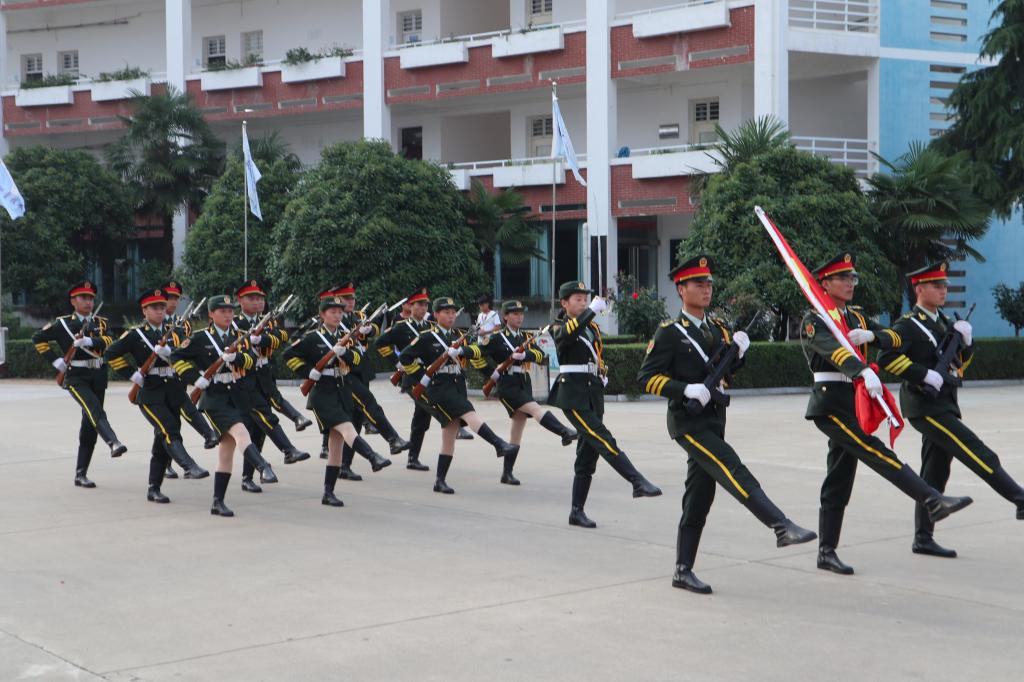 早晨七时,学院国旗护卫队精神饱满,护卫着国旗,迈着铿锵有力的步伐,气势恢宏地护送国旗而来。随着嘹亮的国歌声响起,全体师生怀着崇高的敬意向国旗行注目礼。