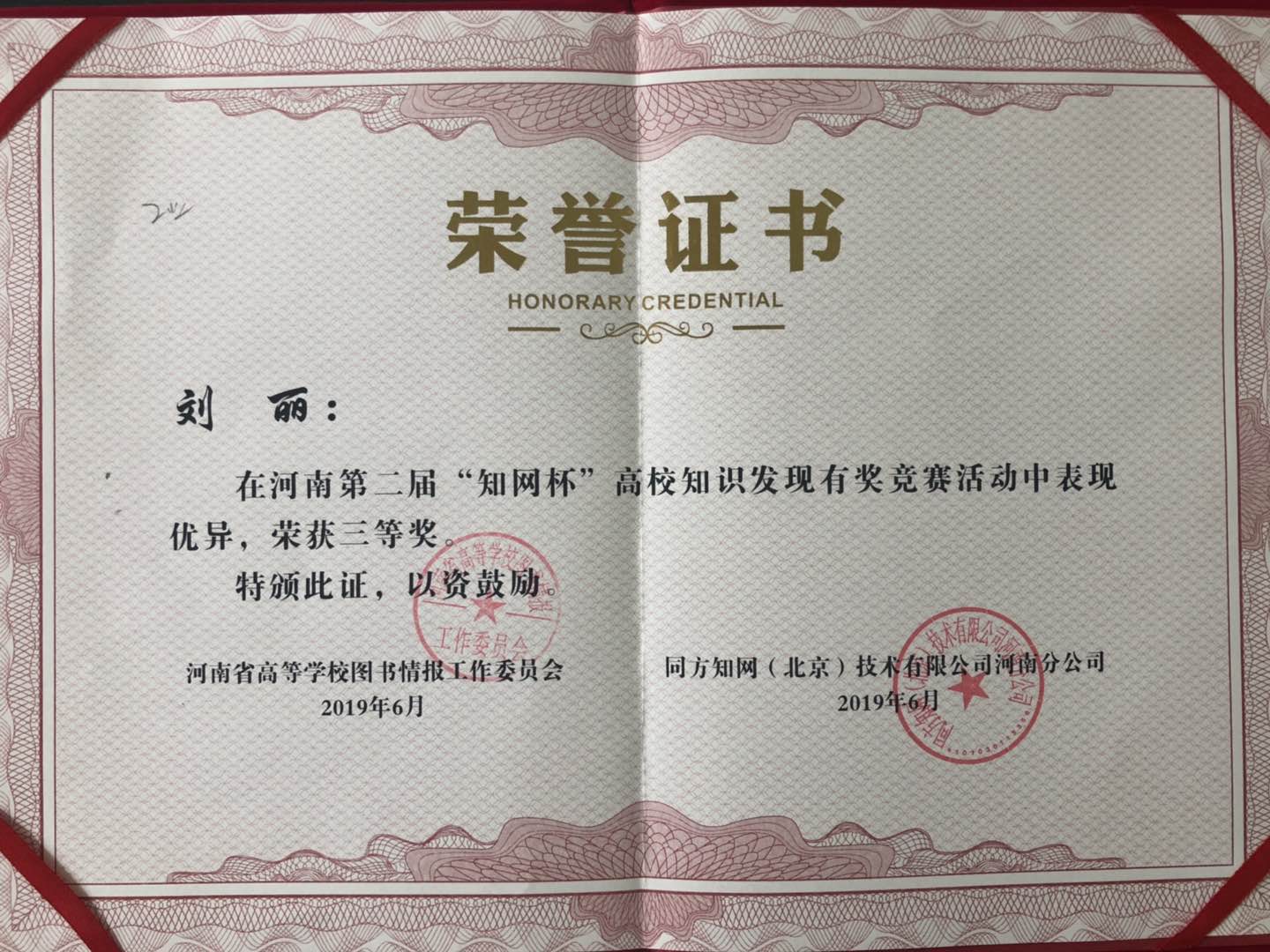 河南省83所高校2万余名师生参与此次大赛,经过激烈比拼,我校B会计学1801班的李浩哲和刘丽同学荣获三等奖,展现了我校学生良好的信息知识水平和信息文化素养。 (供稿/图书馆 撰稿/闫兵摄影/金莹单位审核/刘红普 编审/侯卓)
