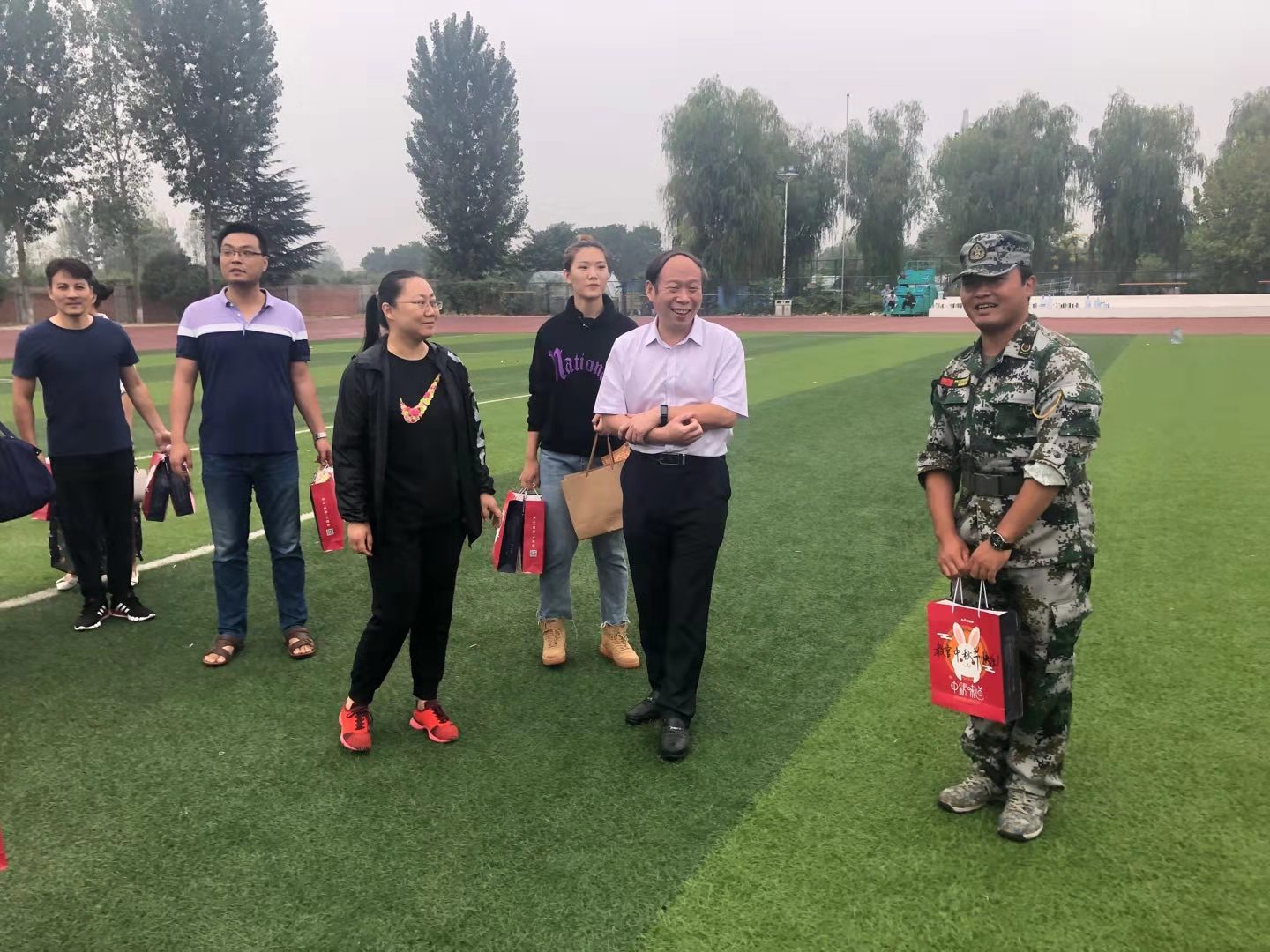 中秋节的清晨,应用外语与国际教育系党总支书记王纪信、副主任王冕和全体19级新生班主任在节日的一大早就来到新训营地,为参训的新生送去节日的祝福。