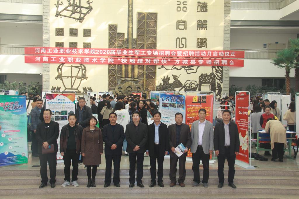 11月3日,新葡的京集团8814vip举办2020届毕业生军工专场招聘会之际,方城县产业集聚区副主任薛学堂、人社局副局长李东方等携产业集聚区20余家企业来我校参加专场招聘会,并在招生就业处会议室参加座谈会,副校长王仁伟出席会议,组织部、招生就业处、产教融合中心、电子信息工程学院负责人参加本次座谈会。