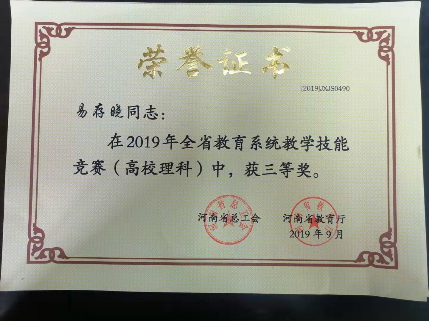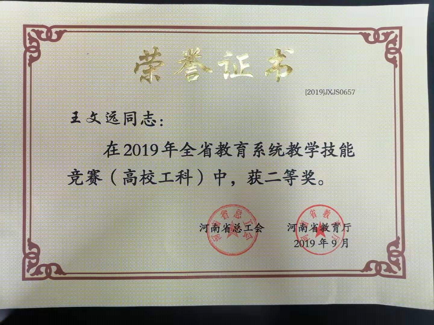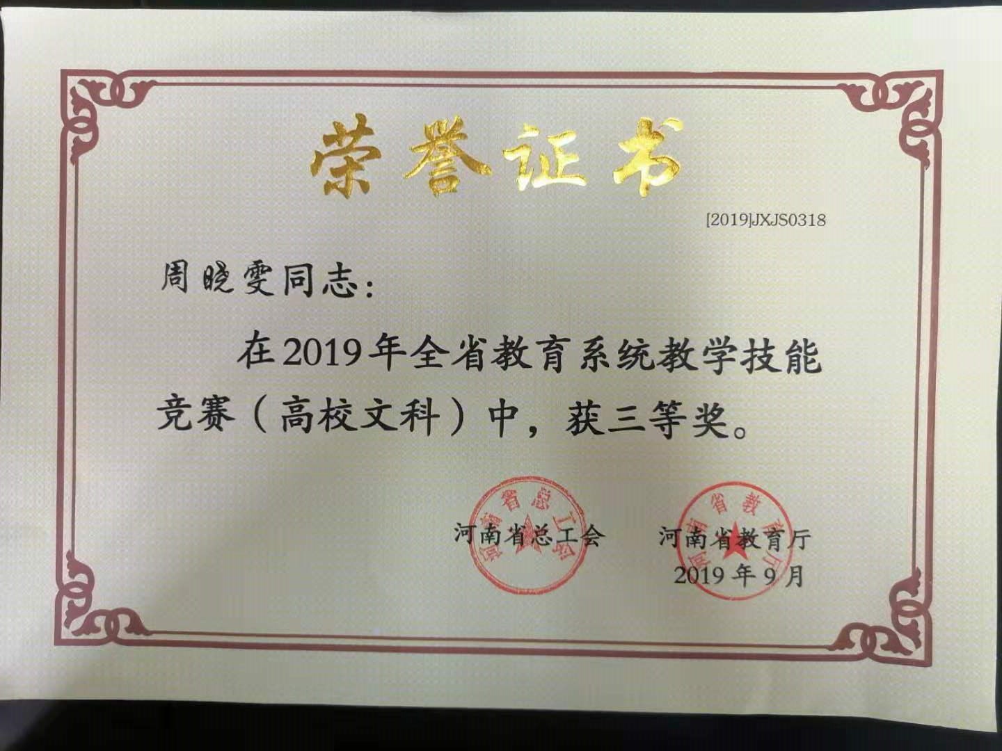 2019年9月5日,河南省教育厅、河南省总工会联合下发《关于表彰2019年全省教学技能竞赛获奖个人的决定》(豫工文﹝2019﹞70号)文件,表彰教学技能竞赛获奖个人。我校杨乐、田睿、刘欣宁三位同志荣获一等奖,被授予“河南省教学标兵”荣誉称号;刘海志、王文远两位同志荣获二等奖;周晓雯、易存晓两位同志荣获三等奖。