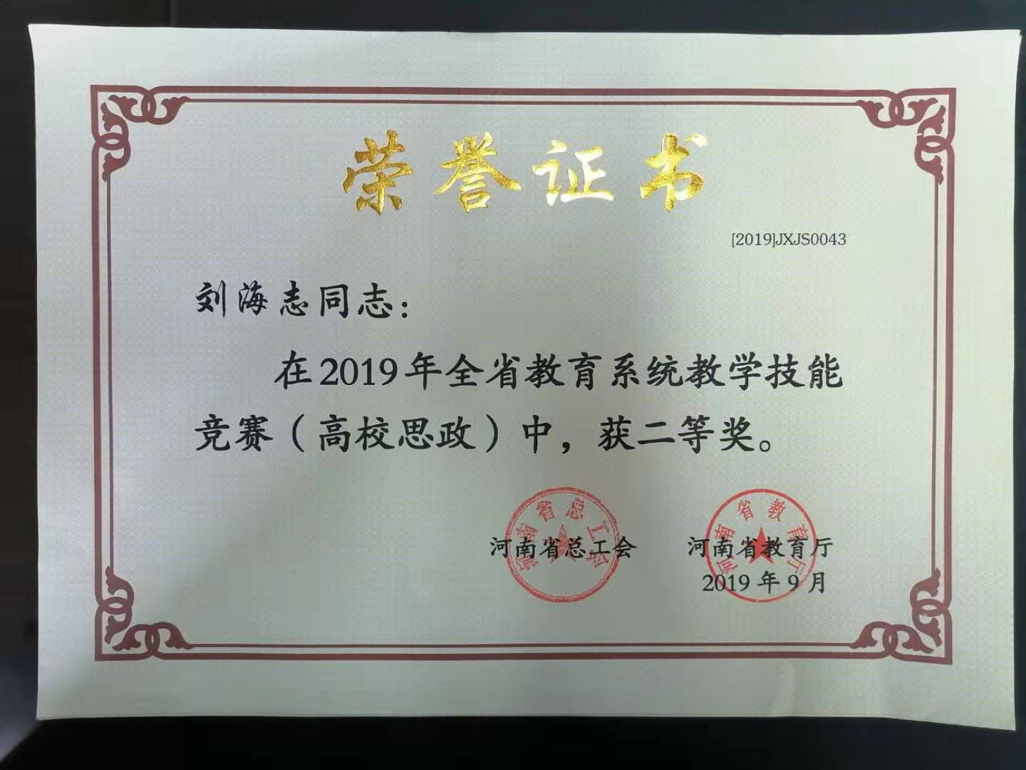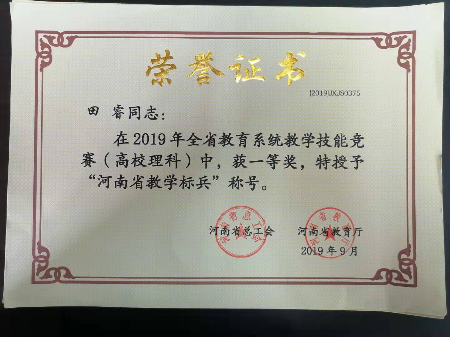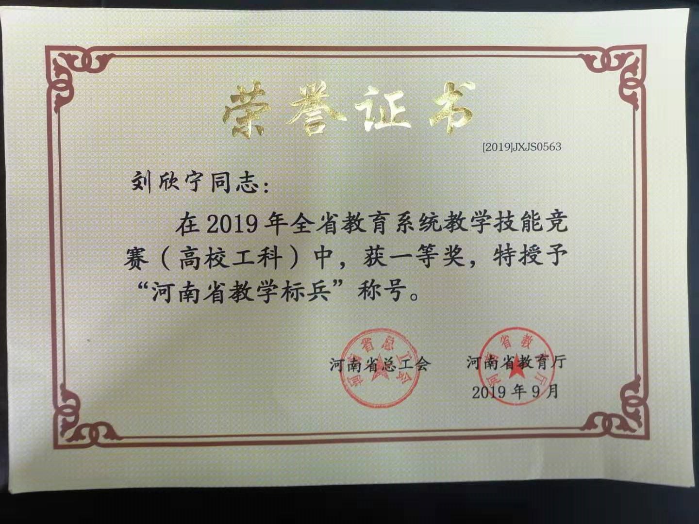 2019年9月5日,河南省教育厅、河南省总工会联合下发《关于表彰2019年全省教学技能竞赛获奖个人的决定》(豫工文﹝2019﹞70号)文件,表彰教学技能竞赛获奖个人。我校杨乐、田睿、刘欣宁三位同志荣获一等奖,被授予“河南省教学标兵”荣誉称号;刘海志、王文远两位同志荣获二等奖;周晓雯、易存晓两位同志荣获三等奖。