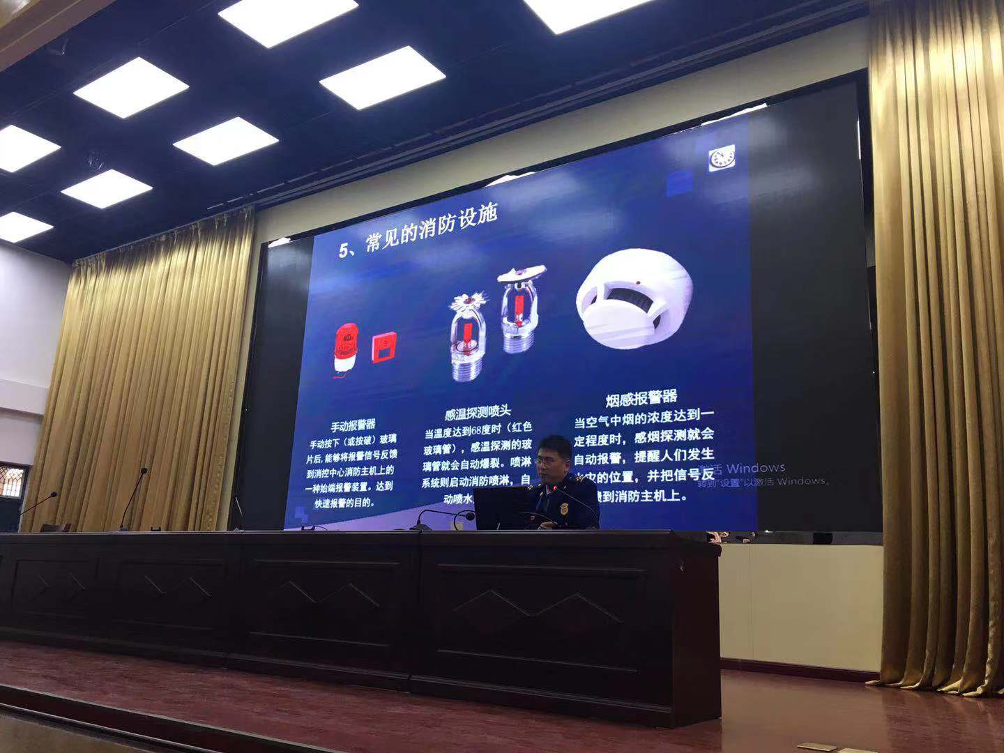 在培训过程中,南阳市消防支队院振鸿科长结合一些校园火灾案例,深入浅出的讲解了常用灭火器材、室内消防设施、逃生疏散器材等使用方法及日常防火注意事项。重点讲授了如何安全用电、安全用火、预防校园火灾以及发生火灾后如何应急灭火、组织逃生自救等消防安全知识。通过此次专题培训,使参训人员意识到了火灾防控工作的重要性和紧迫性,也引导全校师生人人关注消防、人人参与消防、人人维护消防安全,全校共同努力维护校园消防安全形势稳定。(供稿/保卫处 撰稿/尚韬 摄影/尚韬 单位审核/赵国峰 编审/侯卓)