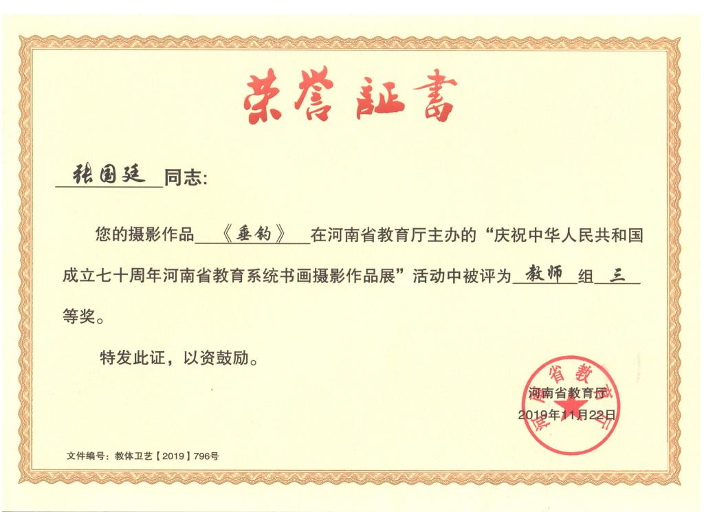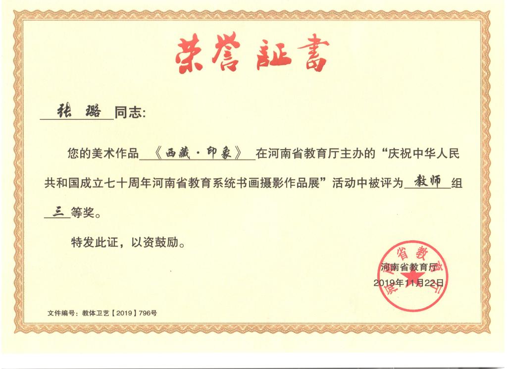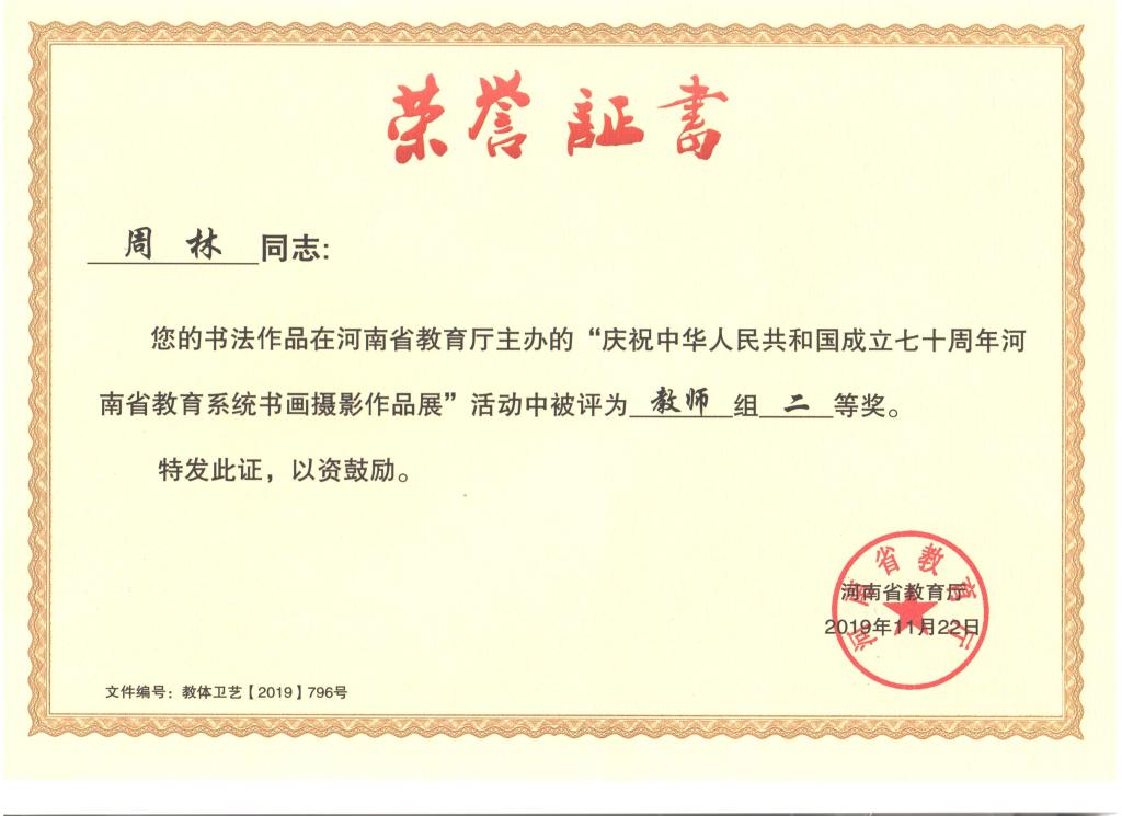 2019年是中华人民共和国成立70周年,为了充分展示全省教育系统广大师生的爱国热情,抒发爱国情怀,省教育厅举办了“翰墨绘盛世 丹青颂祖国——河南省教育系统庆祝新中国成立70周年书画摄影优秀作品展”等系列美育活动,共收到各类作品6000余件。参展作者来自全省各级各类学校的教师、学生,作品中既有对新中国成立70年来辉煌成就的讴歌,也有对我省教育战线累累硕果的赞美,更有师生们对美好生活的向往、对美丽中国梦的憧憬。艺术教育中心在接到教育厅文件后,立即召开专题会议,传达文件精神,进行工作部署,向全校师生共征集到作品30余件,从中择优上报教育厅。经过激烈角逐,我校教师最终获得一等奖1项、二等奖1项和三等奖2项的佳绩。
