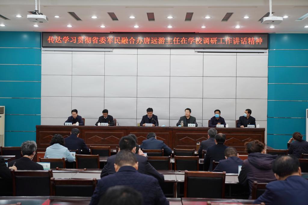 3月26日,学校在办公楼第一会议室召开全体中层正职干部会议,传达学习中共河南省委军民融合发展委员会办公室常务副主任唐远游同志在学校调研座谈会上的讲话精神,安排部署贯彻落实工作。党委书记温道军主持会议并讲话,全体校领导出席会议,中层干部正职参加会议。副校长王仁伟传达了唐主任调研学校情况和在座谈会上的讲话精神。