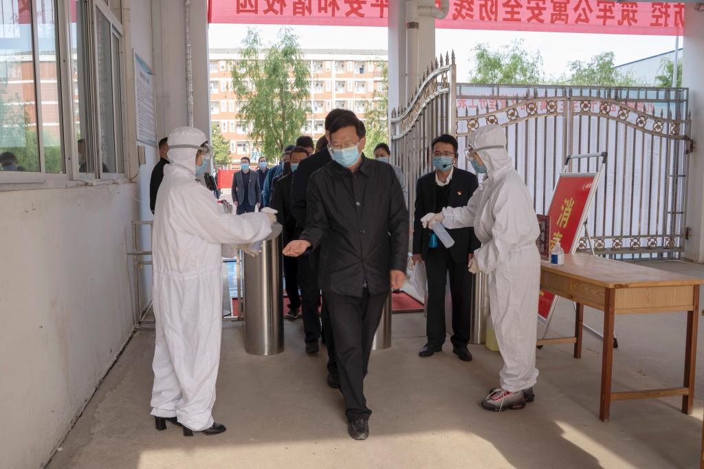高治军一行在学校领导陪同下深入教室和学生餐厅、公寓,实地察看疫情防控期间学校教学管理、错峰就餐、宿舍管理等安排,详细了解学校联防防控网格体系建设、教学和学生管理、师生健康信息排查、开学防控制度建设、校园环境整治等情况,仔细询问学校在疫情防控和复学工作中存在的问题和困难,并提出指导意见和具体工作要求。