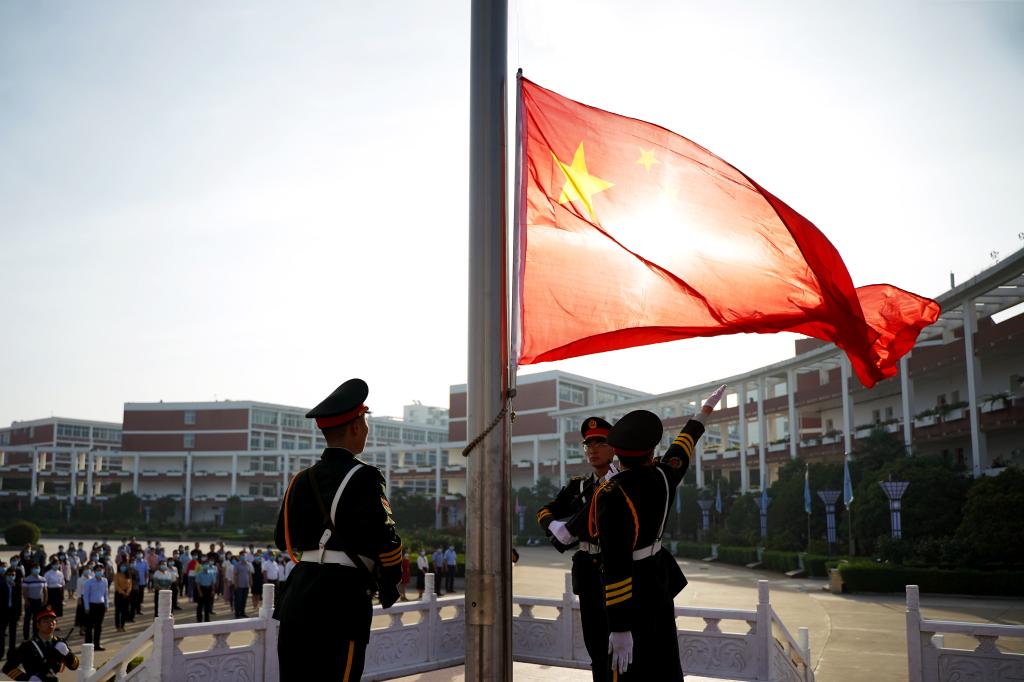 伴着雄壮激昂的国歌,五星红旗迎着初升的太阳冉冉升起,在晨曦中迎风飘扬。