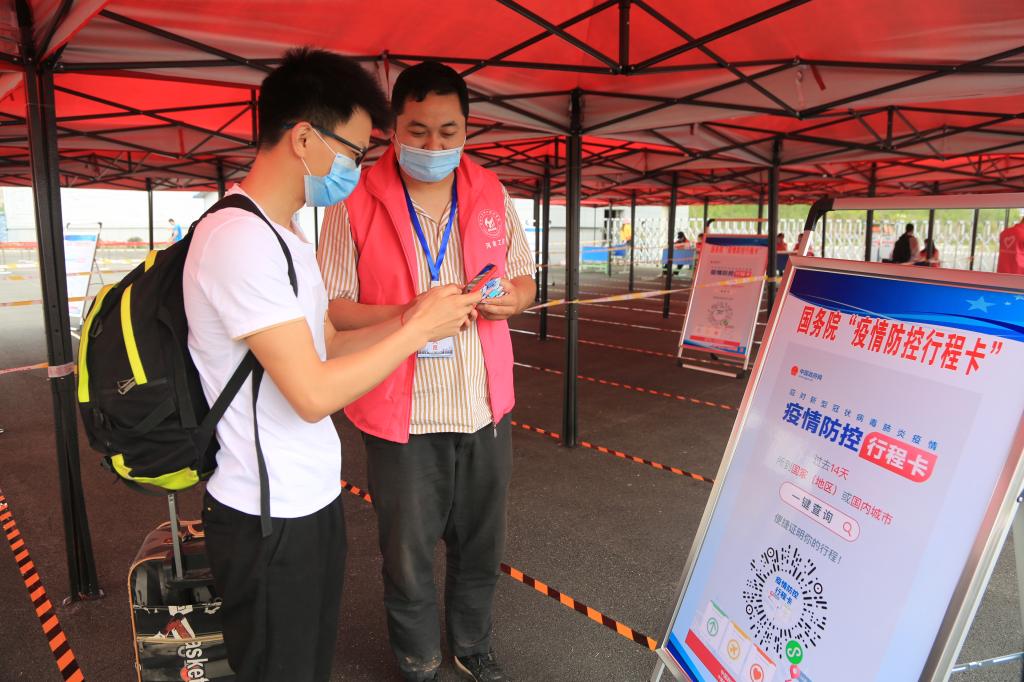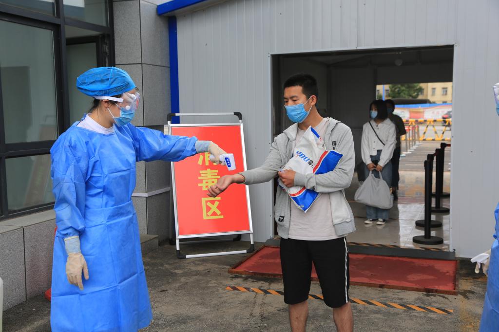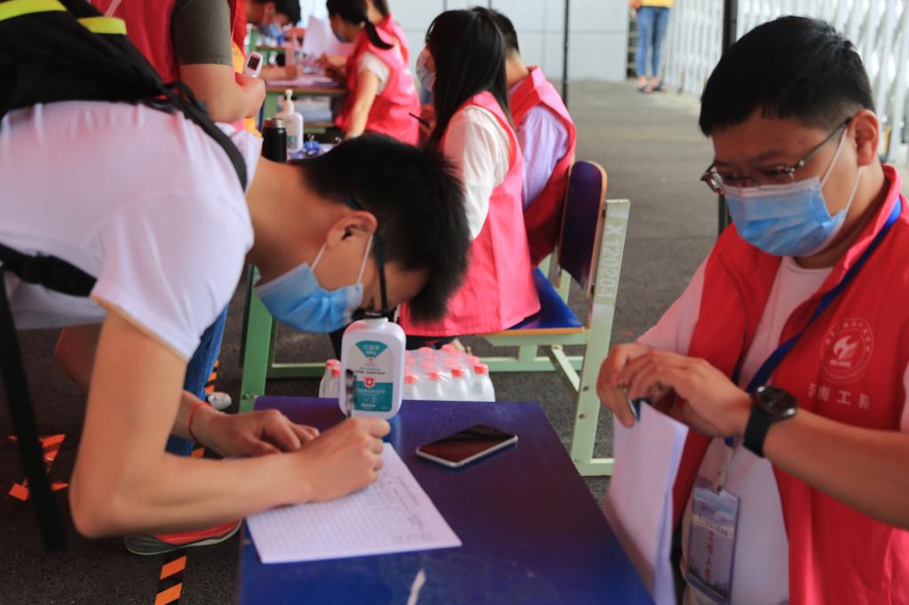 报到点内,返校学生佩戴口罩单人单向保持1.5米间隔进入身份审核区排队,在出示个人身份证件后扫码核对近14天行动轨迹,行程卡为绿码的同学由各院系收缴学生返校申请和相关登记表、承诺书等资料,并发放提前制作好的校园临时通行卡,学生持校园临时通行卡进入热成像测温棚通道进行体温检测,然后由工作人员对学生进行人身、鞋底及行李物品消毒,在更换口罩、发放返校复学告知书后进入校园。各工作环节严格规范,衔接紧密,秩序井然,现场工作人员“车辆即停即走”“请有序排队”“请保持1.5米距离”“请出示行程卡”等温馨提示不时响起,让人倍感亲切,同学们更是纷纷点赞。