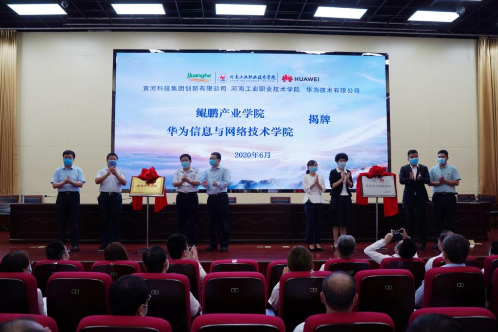 省委军民融合发展委员会办公室副主任袁玉新、省教育厅高教处处长张水潮、黄河科技集团创新有限公司董事长冯武、学校党委书记温道军共同为“鲲鹏产业学院”揭牌。南阳市人民政府副市长阿颖、省教育厅高教处副处长张小茜、华为技术有限公司河南政企副总经理石斌、省教育厅职成教处刘东洋共同为“华为信息与网络技术学院”揭牌。