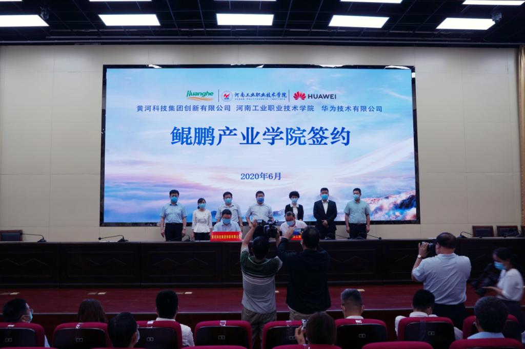 仪式上,黄河科技集团创新有限公司董事长冯武、新葡的京集团8814vip党委副书记、副校长杜建根代表校企双方,签订共建“鲲鹏产业学院”合作协议。