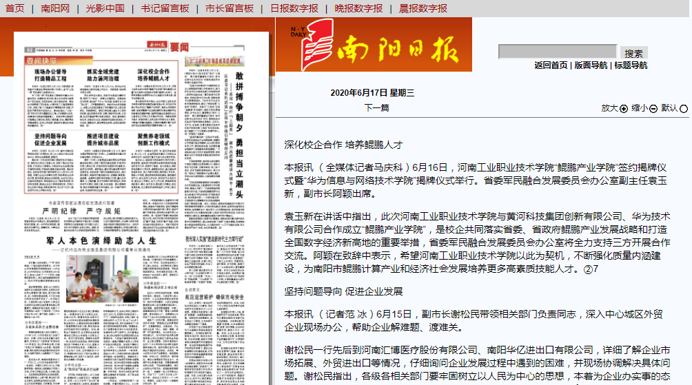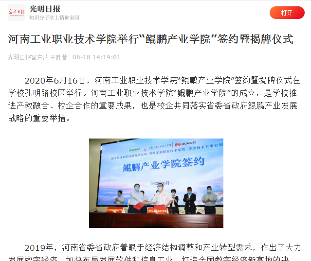近日,我校鲲鹏产业学院签约暨揭牌仪式受到新闻媒体的广泛关注,《光明日报》客户端、《人民日报》客户端、人民网、《河南日报》客户端、今日头条、百度、央广网、中国广播网、河南高校咨询网、《南阳日报》、南阳广播电视台等媒体对揭牌仪式进行了专题报道。(撰稿/杨爽 编审/王爽)