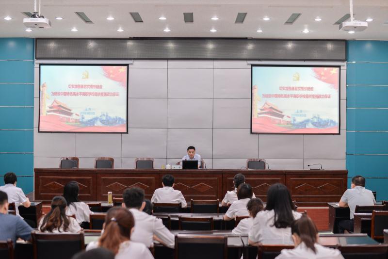 2020年6月29日上午,校长王伟在孔明路校区一楼会议室以《加强基层党组织建设,为建设中国特色高水平高职学校提供坚强政治保证》为题作了一场专题党课。财务党支部、城市建设学院党总支全体党员参加党课学习,城市建设学院党总支书记王兴举主持。
