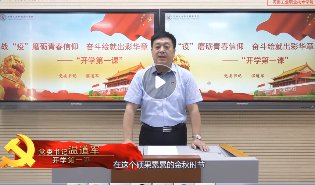 为抓住返校复学第一天的教育机遇,学校充分利用省教育厅提供的“返校复学第一课”资源,结合学校工作实际,精心制作“开学第一课”教育视频。学校党委书记温道军以《战“疫”磨砺青春信仰 奋斗绘就出彩华章》为题,讲述了疫情彰显的国家制度自信、学校使命担当和青年奋斗风采。校长王伟以《落细落实疫情防控措施 确保师生生命安全和身体健康》为题,介绍学校疫情防控整体情况和开学后各项工作部署。校医院医生路超讲解了校园个人防护知识。