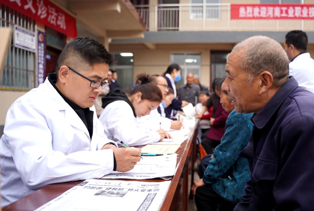 在学校送医下乡的活动现场,医务人员耐心解答村民对自身健康所提出的问题,给予合理化的建议和诊疗方案,以亲切的交流和专业的素养,给老百姓病痛的身心以慰藉。