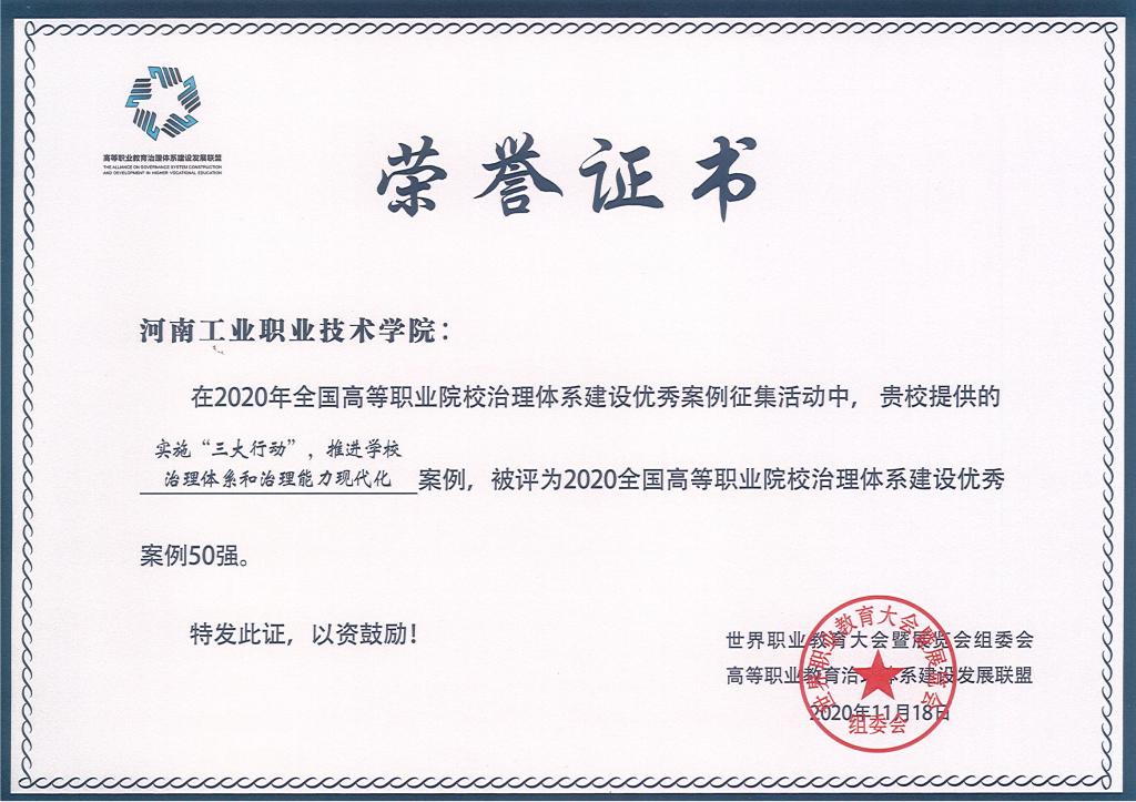 我校荣获“2020全国高职院校治理体系建设优秀案例50强”