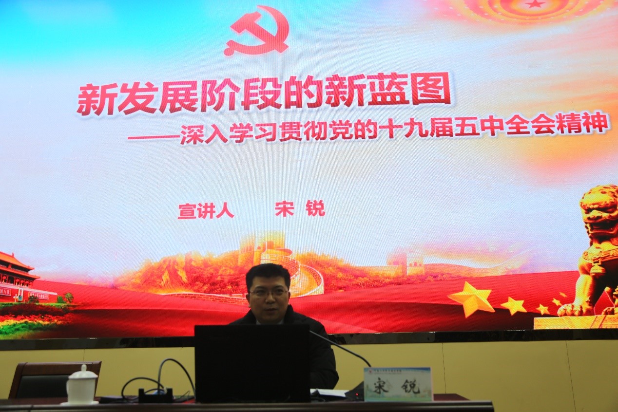党的十九届五中全会是在我国即将全面建成小康社会、乘势开启现代化建设新征程的关键时期,召开的一次十分重要的会议。为了进一步宣传贯彻十九届五中全会精神,加强全校党员干部对十九届五中全会精神的理解。12月10日上午,学校特邀河南省青年理论宣讲专家、南阳市委党校宋锐讲师为师生做辅导报告。报告会在孔明路校区大学术报告厅举行,校领导温道军、王仁伟、刘纪山、贾庆成、李荣胜、屈保中、樊有平,全体中层干部、党员教师、学生代表聆听了报告会。报告会由校党委书记温道军主持。