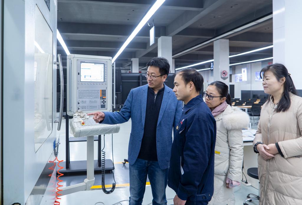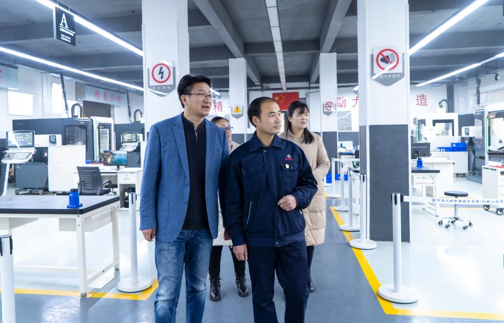 会后,余军伟在机械工程学院院长朱成俊、党总支副书记苏君的陪同下,参观了学校五轴加工中心,并就“学校实训中心建设”“校企合作项目”“五轴加工发展水平”“产品质量提升”等问题,进行了深入交流。