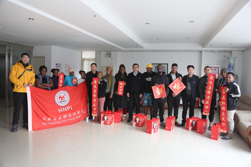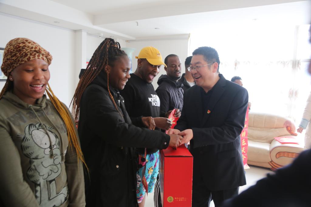 在学校留学生公寓,留学生提前准备了红彤彤的春联、福字、福牛,迎接校领导的到来。王伟校长详细询问了留学生学习、生活情况,叮嘱留学生科学防疫、合理安排假期生活、及时向家人报平安。来自南非、印度尼西亚的留学生们洋溢着开怀的笑容,喜悦地接过学校领导送来的春节慰问品,真切地感受中国传统节日营造出的热闹喜庆氛围。