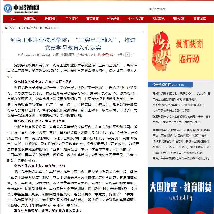 2021年4月14日-15日,中国网、中国教育网、环球网、搜狐网、中华网、中华高校网、中新资讯网、腾讯、哔哩哔哩、今日头条、河南高校资讯网、河南经济论坛等数十家媒体对我校多措并举扎实开展党史学习教育进行报道。