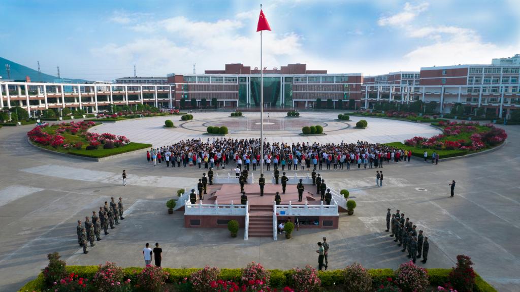 6点45分,校国旗护卫队全体成员整装待发,随着主持人宣布升旗仪式开始,飒爽英姿的他们迈着整齐有力的步伐,护卫五星红旗走向升旗台。伴随着雄壮激昂的国歌,鲜艳的五星红旗迎风飘扬,冉冉升起。全体现场师生昂首挺立,向国旗行注目礼,高声齐唱国歌。