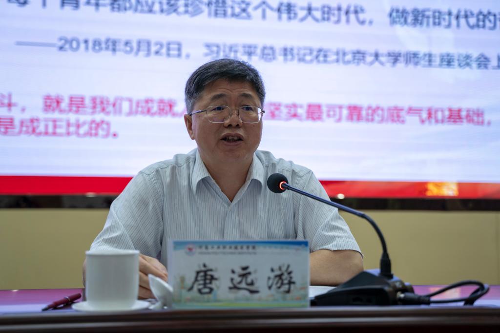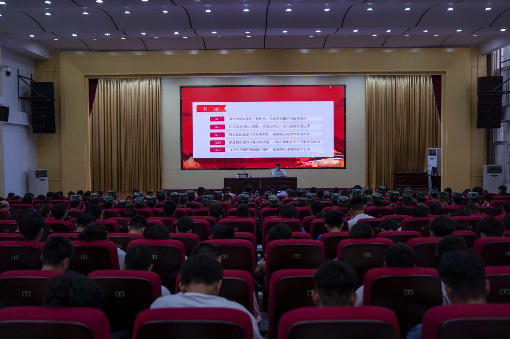 5月25日,河南省委军民融合发展委员会办公室常务副主任唐远游在学校孔明路校区学术报告厅为我校师生讲授党史学习教育专题思政课,校党委书记温道军主持,全体校领导、党委部门负责人、各党总支(直属党支部)书记、基层支部书记以及学生代表等400余人聆听授课。