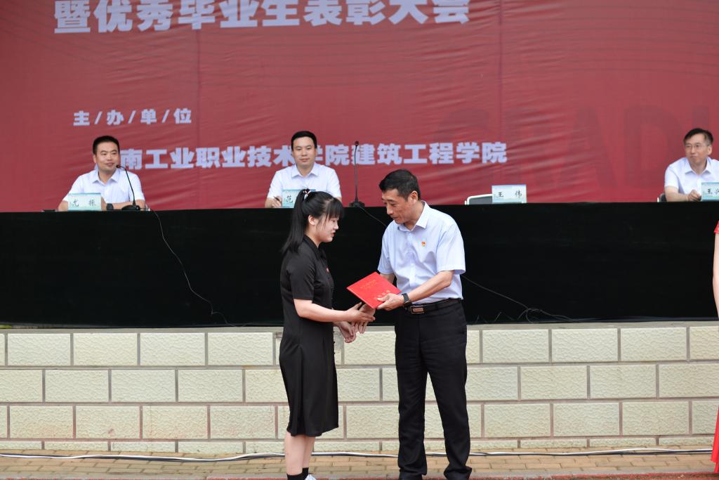 在雄壮的国歌声中,毕业典礼正式开始。学院党总支书记王兴举介绍了学院2021届毕业生毕业资格审查情况,并宣读了《河南省教育厅关于表彰省级优秀毕业生的决定》和《新葡的京集团8814vip关于表彰校级优秀毕业生的决定》。伴随着欢快激昂的音乐,与会领导为受到表彰的省级、校级优秀毕业生颁发了荣誉证书。
