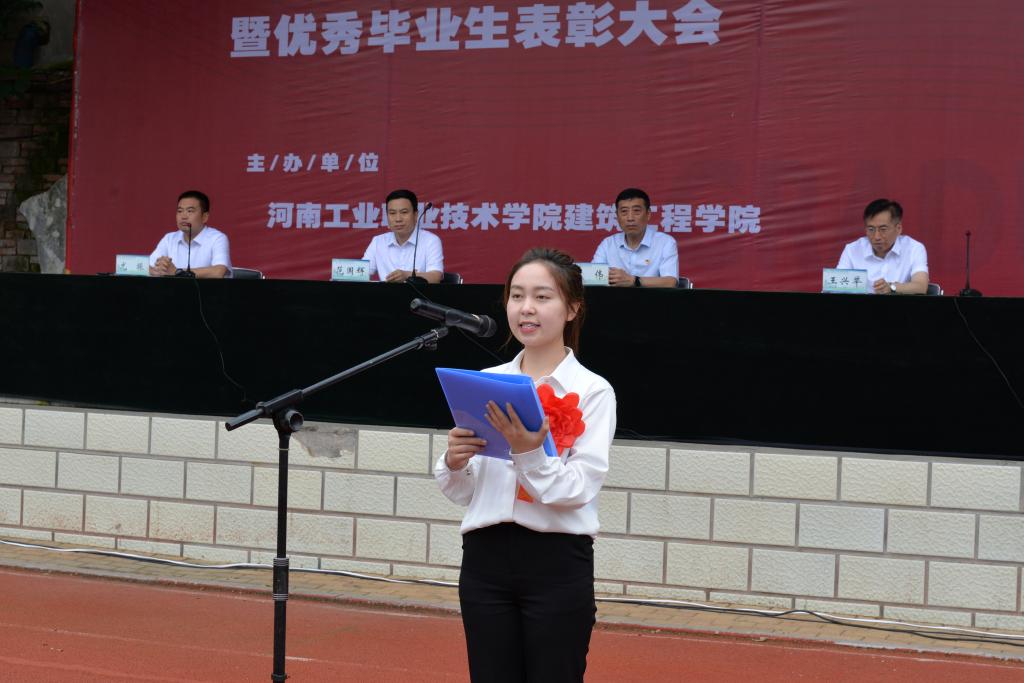 毕业生代表、河南省优秀毕业生室内设计1801班张一凡同学的发言声情并茂,她深情分享了三年的求学时光,对母校这些年日新月异的变化、发展深感自豪,感恩家人和同学的付出与帮助,感谢老师们的关怀与培养,同时表示决不辜负母校的辛勤培育和老师的谆谆教诲,铭记“厚德笃学,知行合一”的校训,努力工作,争做青年表率,争当社会栋梁。