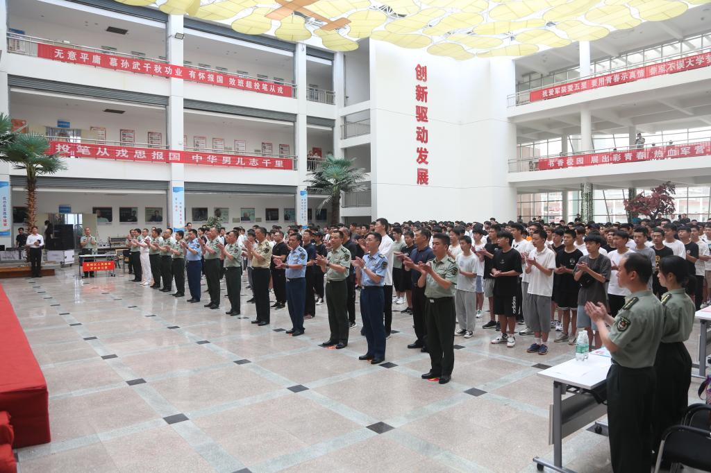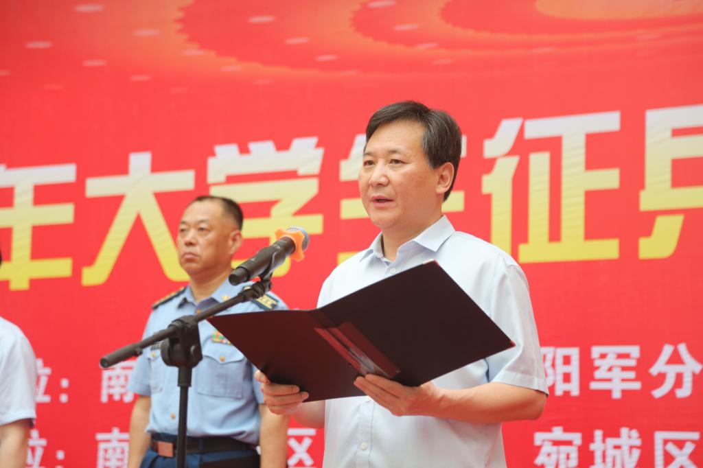 温道军代表学校致辞,他指出,我校高度重视大学生征兵工作,主动适应“一年两征”改革,通过强化奖惩激励机制,细化分解征兵任务,大力宣传征兵政策,一对一做好咨询服务,在全校形成了“人人关心国防、支持国防和征兵工作”的良好局面,自2017年以来,累计向部队输送1032名大学生,连续三年征兵数量位居全省高校第一名,连续四年超额完成征兵任务,连续五年荣获省、市征兵工作成绩突出单位,截至6月24日,下半年征兵报名1616人,征兵宣传动员效果显著。
