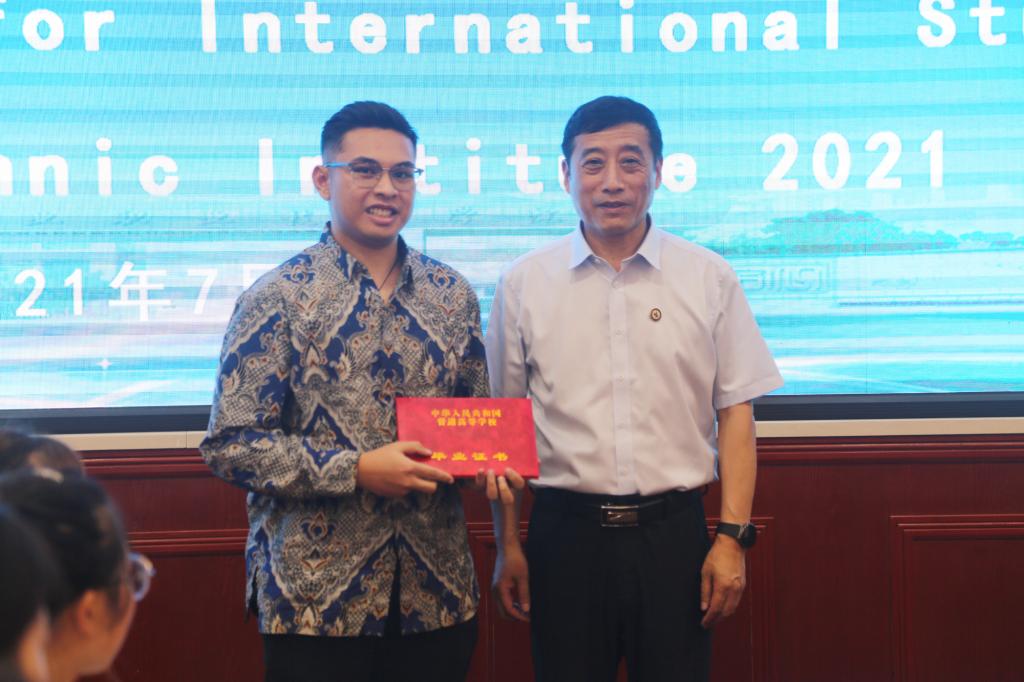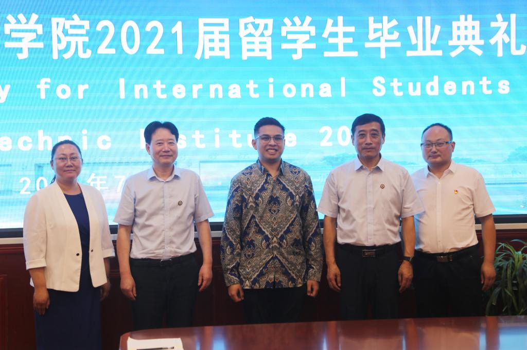 校长王伟教授向2021届留学生毕业生代表颁发了毕业证,与毕业生合影留念并向毕业生发表了饱含深情的寄语:对留学生克服新冠肺炎疫情顺利完成学业表示热烈祝贺,希望留学生毕业后继续关注中国和学校的发展,做一名中国文化的传播者,在中国和印度尼西亚之间架设起友谊的桥梁。