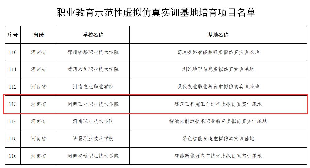 2021年8月4日,教育部发布《关于公布职业教育示范性虚拟仿真实训基地培育项目名单的通知》(教职成司函〔2021〕35号)的通知,我校“建筑工程施工全过程虚拟仿真实训基地”成功入选国家级职业教育示范性虚拟仿真实训基地培育项目。