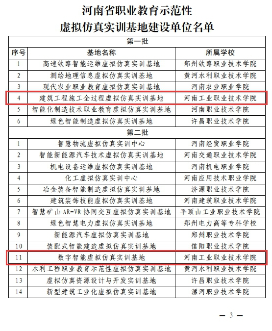 根据教育部和河南省教育厅相关文件要求,在学校领导的指导下,教务处、建筑工程学院和电子信息工程学院组建申报团队,通过集中研讨、分工协作,精心设计、科学编制了虚拟仿真实训基地建设方案,高标准高质量完成项目申报。经河南省教育厅分两批组织专家组进行资料审核、实地考察、综合评审,最终建筑工程学院申报的“建筑工程施工全过程虚拟仿真实训基地”获得河南省第一批入选项目并被推荐到教育部;经教育部组织线上线下专家遴选、公示等环节,成功入选国家级职业教育示范性虚拟仿真实训基地培育项目。