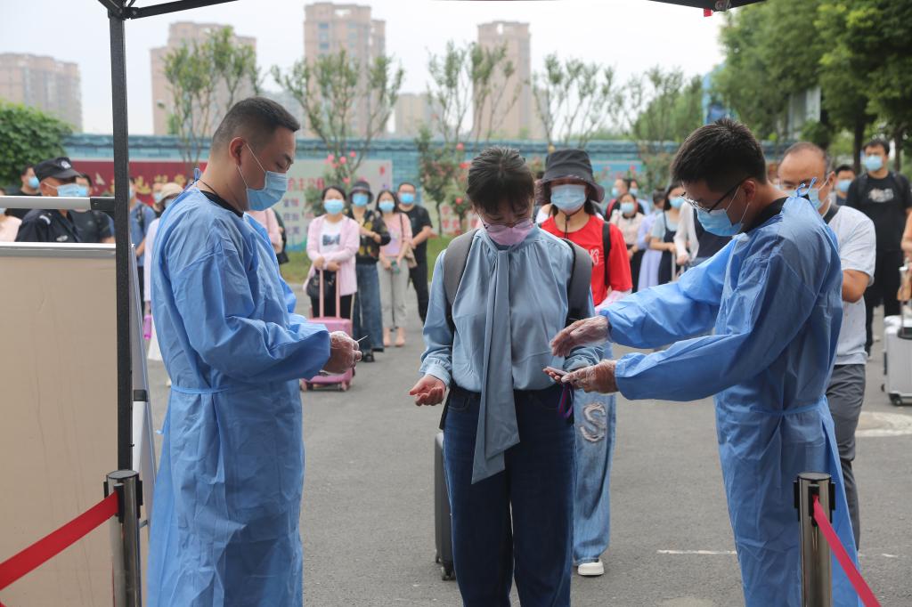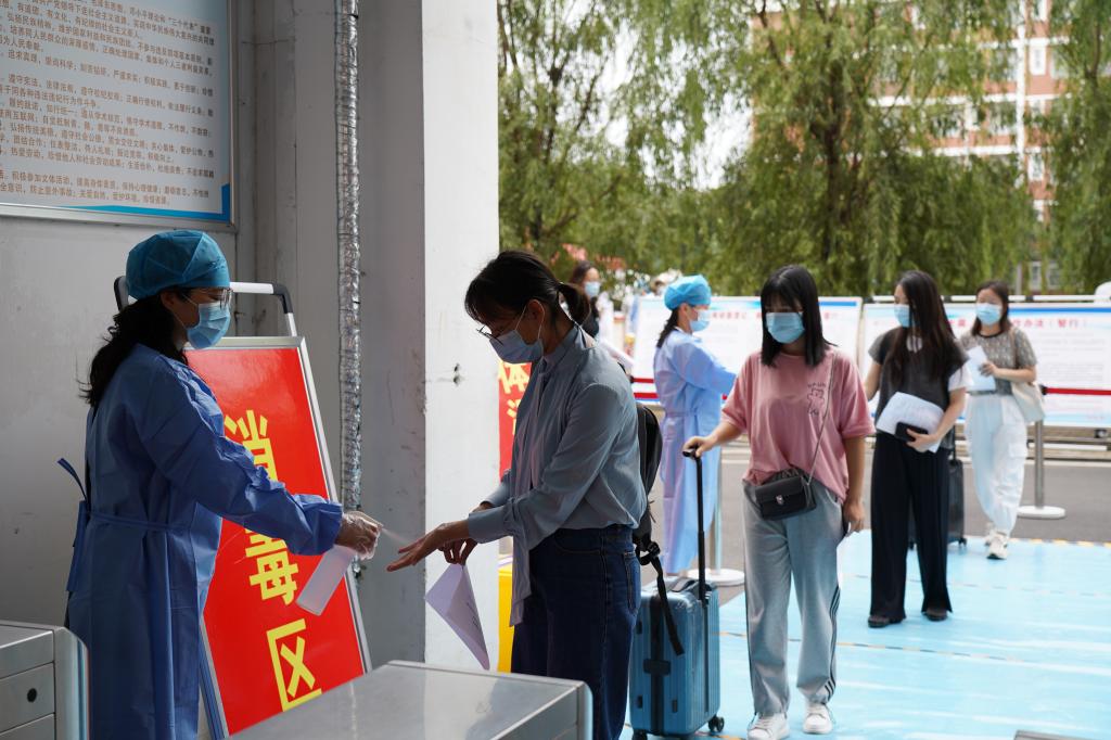 在学生公寓,学生进入公寓的流程及注意事项等展板迎面可见,学生陆续报到入住,工作人员在学生公寓入口处查验学生身份及健康码,完成体温检测、杀菌消毒等程序后,学生保持1米间距有序进入公寓。