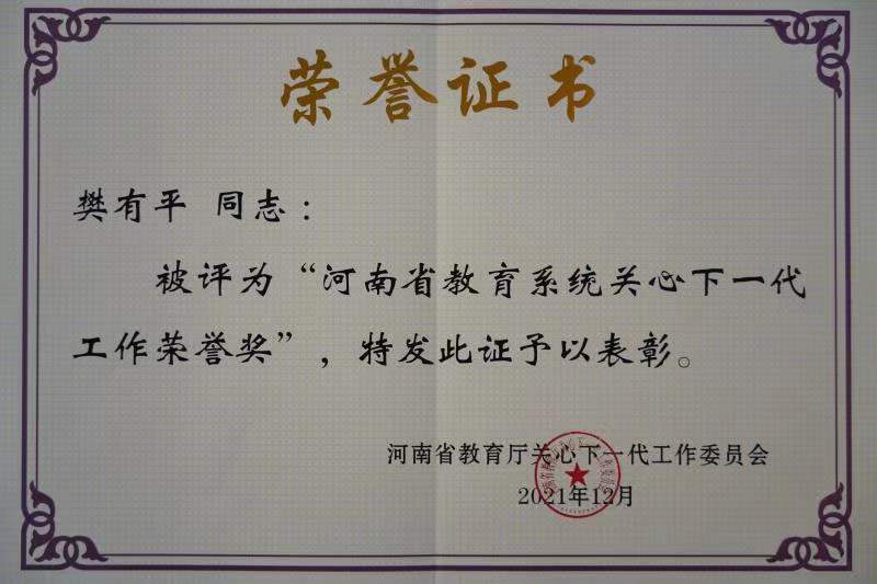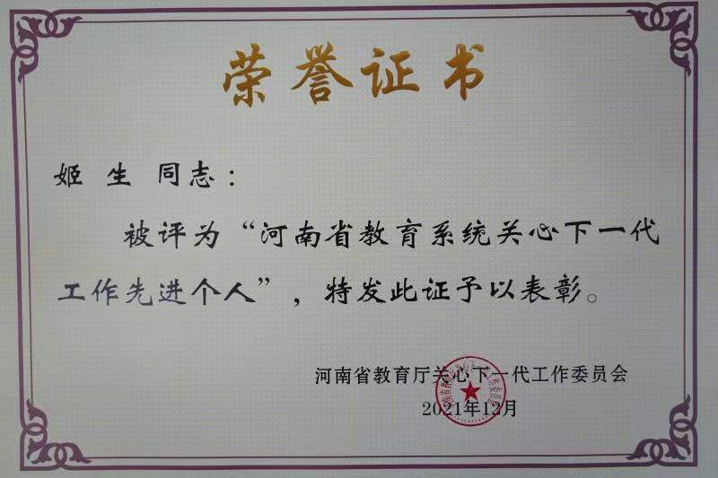 12月7日,省教育厅纪念关工委成立30周年暨全省教育系统关心下一代工作表彰大会在郑州举行。会议对全省教育系统关心下一代工作先进集体和先进个人进行了表彰。我校关心下一代工作委员会荣获“河南省教育系统关心下一代工作先进集体”荣誉称号;樊有平同志荣获“河南省教育系统关心下一代工作荣誉奖”荣誉称号;姬生同志荣获“河南省教育系统关心下一代工作先进工作者”荣誉称号;徐勇连同学荣获“河南省教育系统新时代优秀青少年”荣誉称号。