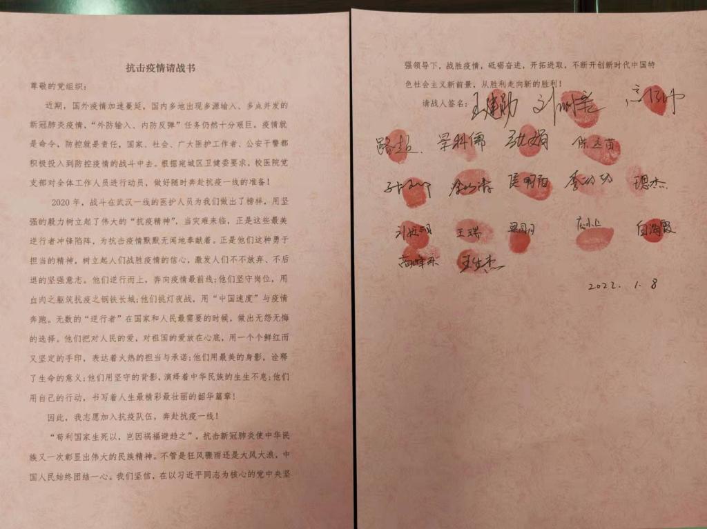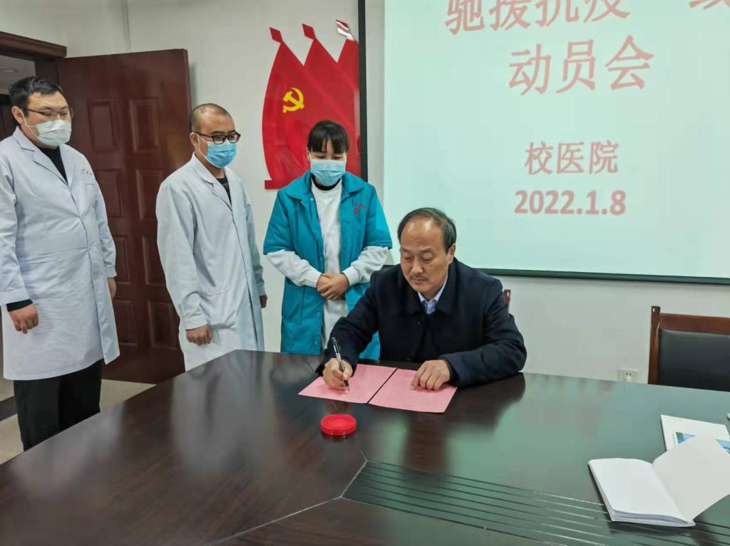 王建勋传达了宛城区卫健委相关会议要求,对驰援抗疫一线工作进行部署,做好随时奔赴抗疫一线的准备。校医院副院长高清伟传达了河南省疫情防控指挥部、南阳市宛城区疫情防控指挥部文件精神,宣读了《抗击疫情请战书》。校医院党支部书记刘明黎对全体工作人员进行动员,要求大家扛牢政治意识,随时听从党的召唤,召之即来、来之能战、战之能胜,使命光荣、责任重大,是一次很好的锻炼借鉴、学习提高的机会。