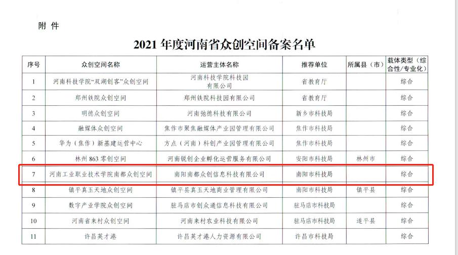 1月24日,河南省科技厅公布了2021年度河南省众创空间备案评审结果,我校南都众创空间顺利通过评审,获批河南省众创空间,这标志着我校创新创业工作又进入了一个新阶段。