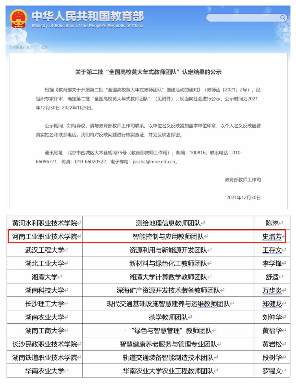 2021年12月30日,教育部发布《关于第二批“全国高校黄大年式教师团队”认定结果的公示》,学校史增芳教授带领的“智能控制与应用教师团队”,聚焦军民融合发展战略、乡村振兴战略、南水北调工程,以技术创新服务区域经济发展,以新葡的京集团8814检测站反哺教育教学,在师德师风、教育教学、科研创新、就业创业、社会服务等方面取得突出成绩,被教育部公示为“全国高校黄大年式教师团队”。