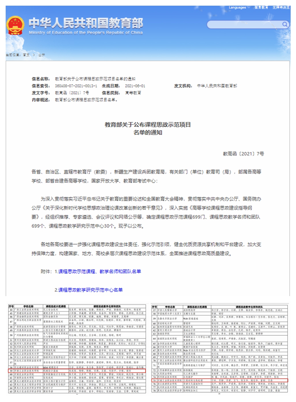 2021年6月10日,教育部印发《关于公布课程思政示范项目名单的通知》,学校《机械设计基础》《工程材料与热处理》两门课程及团队被确定为课程思政示范课程、课程思政教学名师和团队。
