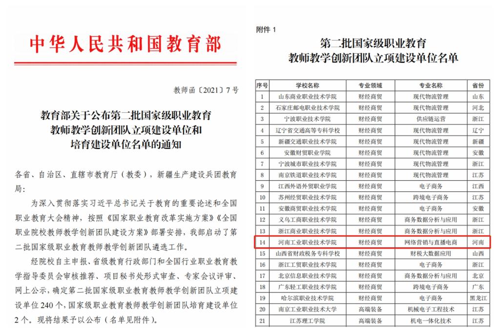 2021年8月9日教育部印发《教育部关于公布第二批国家级职业教育教师教学创新团队立项建设单位和培育建设单位名单的通知》,学校网络营销与直播电商教师教学创新团队被教育部确定为“国家级职业教育教师教学创新团队立项建设单位”。