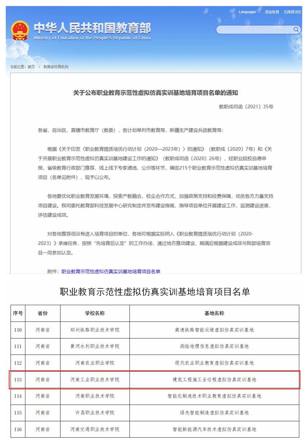 2021年8月4日,教育部发布《关于公布职业教育示范性虚拟仿真实训基地培育项目名单的通知》,学校“建筑工程施工全过程虚拟仿真实训基地”成功入选国家级职业教育示范性虚拟仿真实训基地培育项目。