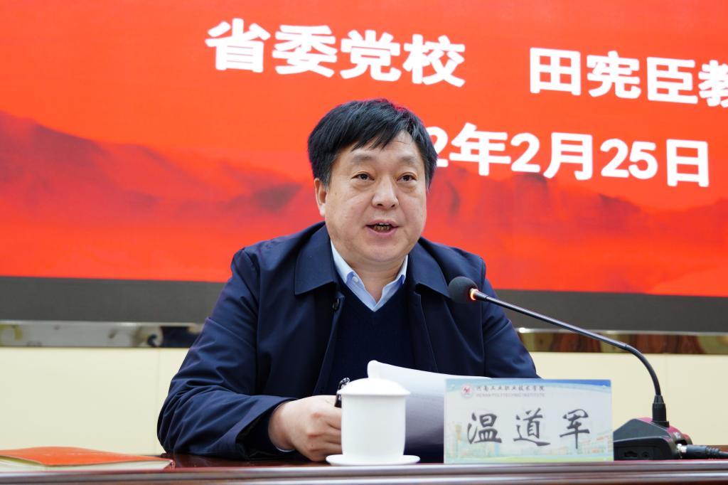 温道军在讲话中指出我们要从习近平总书记关于文化建设的重要论述中找到根本遵循,从党的文化建设成就中汲取宝贵经验,从田教授的讲授中梳理工作思路,按照学校“十四五”校园文化建设规划,出硬招、做实功,建设契合学校发展战略,充满活力、底蕴深厚、特色鲜明的校园文化。