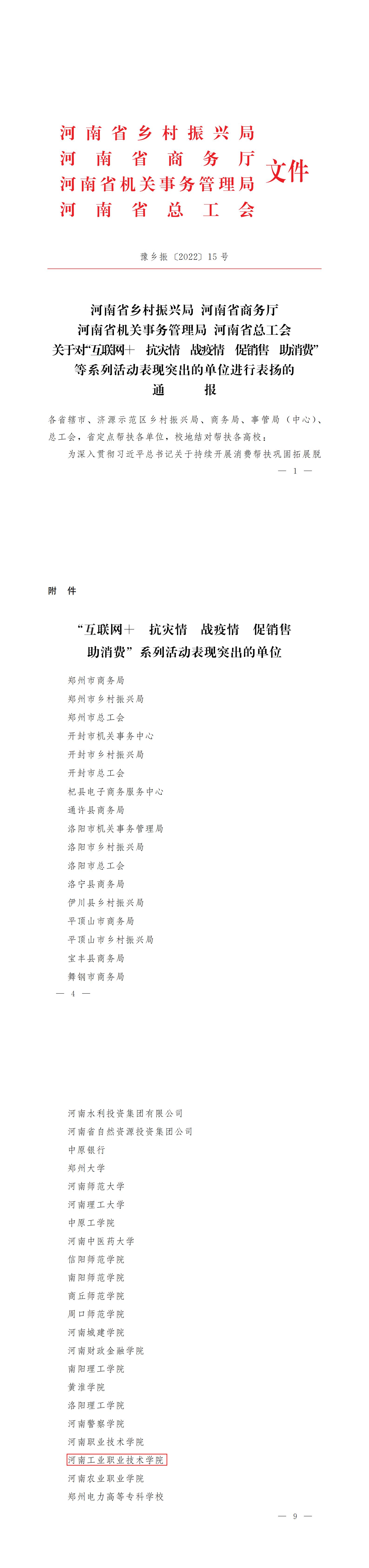附件:河南省乡村振兴局、河南省商务厅、河南省机关事务管理局、河南省总工会《关于对“互联网+抗灾情 战疫情 促销售 助消费”系列活动表现突出的单位进行表扬的通报》