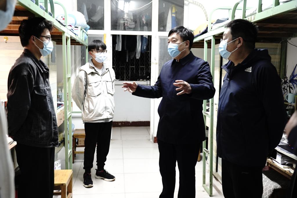 在学生党团活动室,温道军与值班学生亲切交谈,认真听取同学们对学校近期疫情防控工作的反馈情况,鼓励同学们要坚定战胜疫情的决心和信心,作为学生干部要以身作则,将疫情防控政策及时传播给大家,共筑校园安全屏障。在学生宿舍,温道军叮嘱同学们每天做好体温监测,及时通风,注意宿舍卫生清洁,同时询问了解同学们学习生活存在的困难,提醒同学们要增加体育锻炼、注意劳逸结合,科学防护,调整心态及生活节奏,并对同学们在疫情期间能自觉遵守疫情防控要求,严格遵守各项规定,理解支持配合抗疫工作表示感谢,并表示同学们有困难可以向老师和学校反映,学校会时刻关注学生诉求并及时解决。同学们纷纷表示,感谢学校领导老师的关心和帮助,他们将牢记嘱托,严格遵守学校疫情防控期间的各项纪律要求,自觉做好个人防护,用实际行动配合学校做好疫情防控工作。
