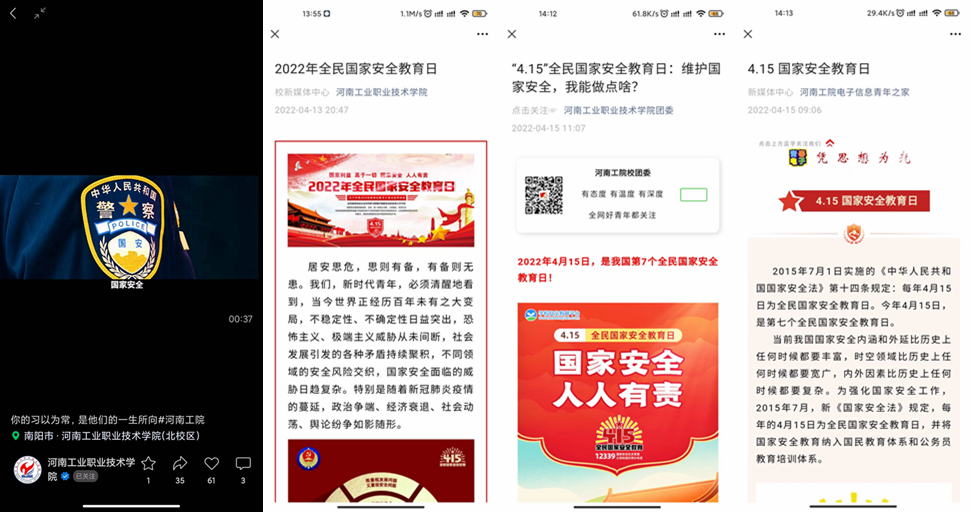 按照学校《全民国家安全教育日活动方案》,学校将组织党委理论学习中心组专题学习习近平总书记关于总体国家安全观重要论述,组织师生观看国家安全专题纪录片《周恩来和中共隐蔽战线》,组织党员干部利用河南干部网络学院、学习通等学习平台收看国家安全相关视频课程,常态化开展国家安全知识学习,结合预防电信诈骗、传销、保密、疫情防控、宗教工作“双防”教育等载体,组织召开主题班会,加强学生的安全知识宣传教育,使国家安全观深入人心,汇聚起维护国家安全的强大力量。