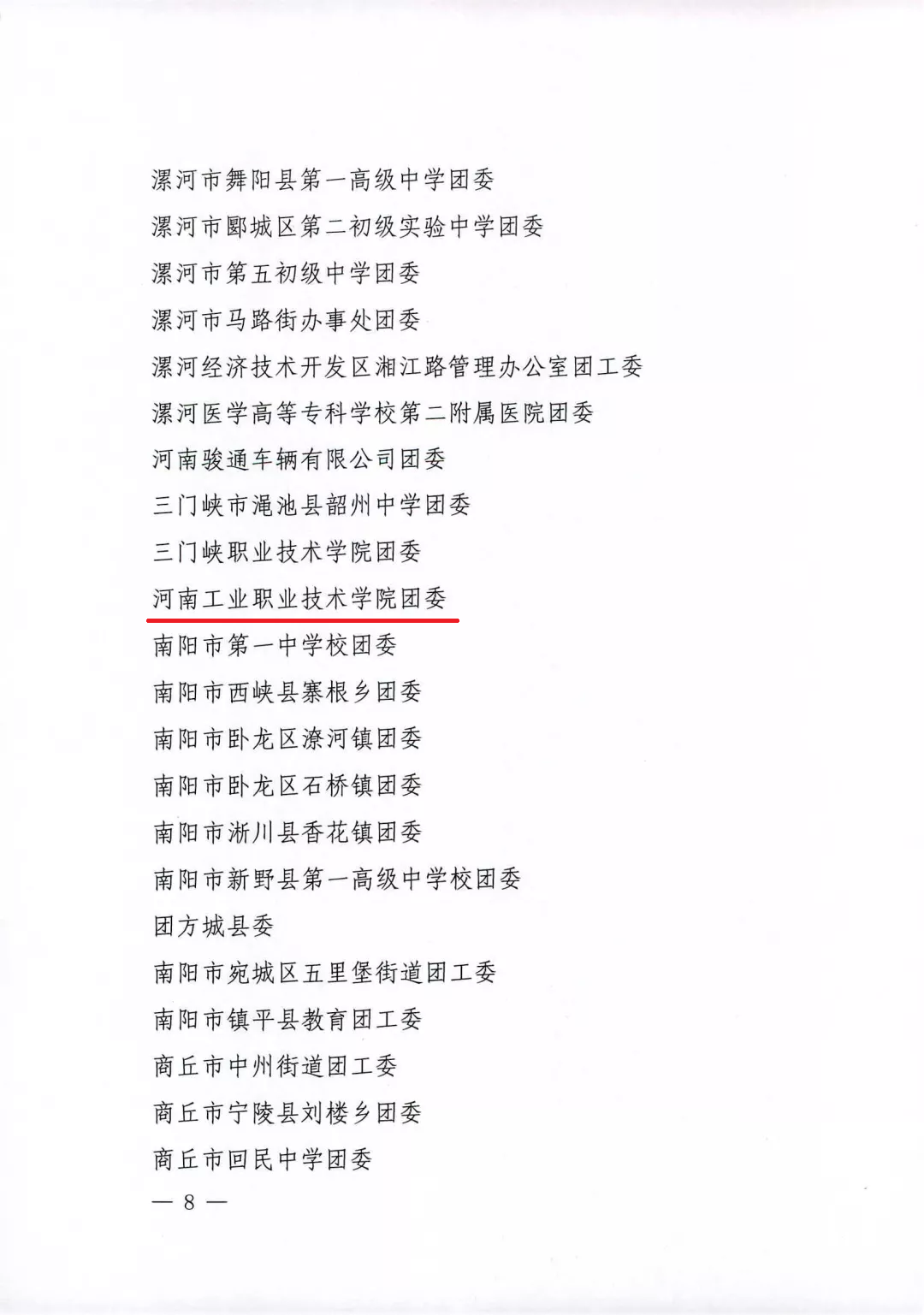 近日,共青团河南省委印发《关于表扬2021年度 “河南省五四红旗团委(团支部)”“河南省优秀共青团员”“河南省优秀共青团干部”的通知》,校团委被授予“河南省五四红旗团委”称号,机械工程学院团总支被授予“河南省五四红旗团支部(团总支)”称号,测绘环保工程学院环境工程1901班张庆恩同学被授予“河南省优秀共青团员”称号。